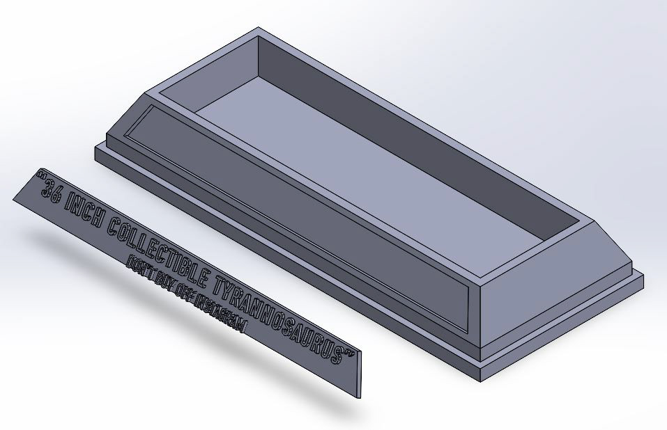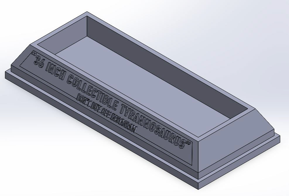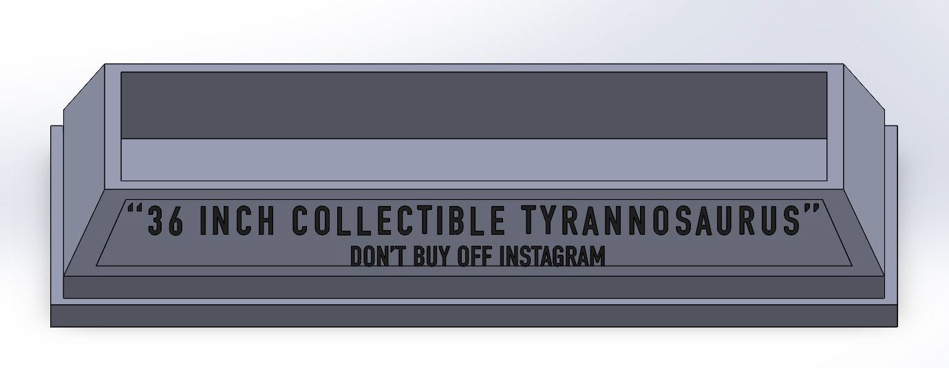 This was when I decided to make a museum piece to show off my purchase in its full glory by modeling the base in SolidWorks and printing it on my FDM printer. I then attached a nice block of wood that has mounting provisions that connect to the feet of the T-Rex.