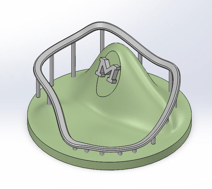 The top was modeled in SolidWorks, which was interesting because it was my first attempt modeling an organic shape. I then printed them on my FDM printer and painted them to match the hill the School of Mines "M" sits on in Golden, Colorado. The bottom was turned out of cherry wood on my lathe, and the two were mated together using glue.